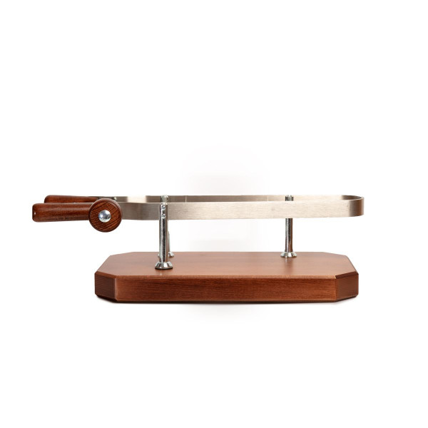 Support à jambon, en acier inoxydable poli mat, avec une plaque en bois laquée.